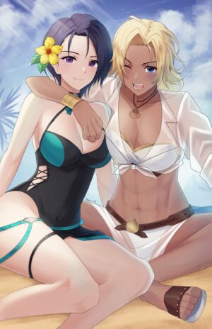 Hentai Eye – 2 girls abs alluring athletic female beach bikini black hair blonde hair