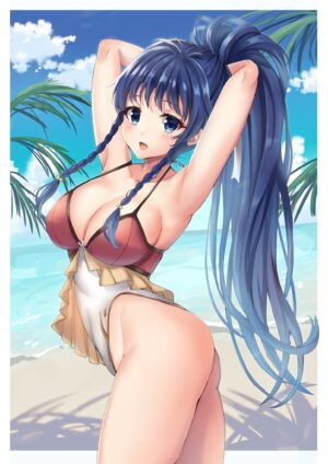 Hentai Eye – 1girl absurd res alluring antenna hair ass beach black hair blue eyes braid